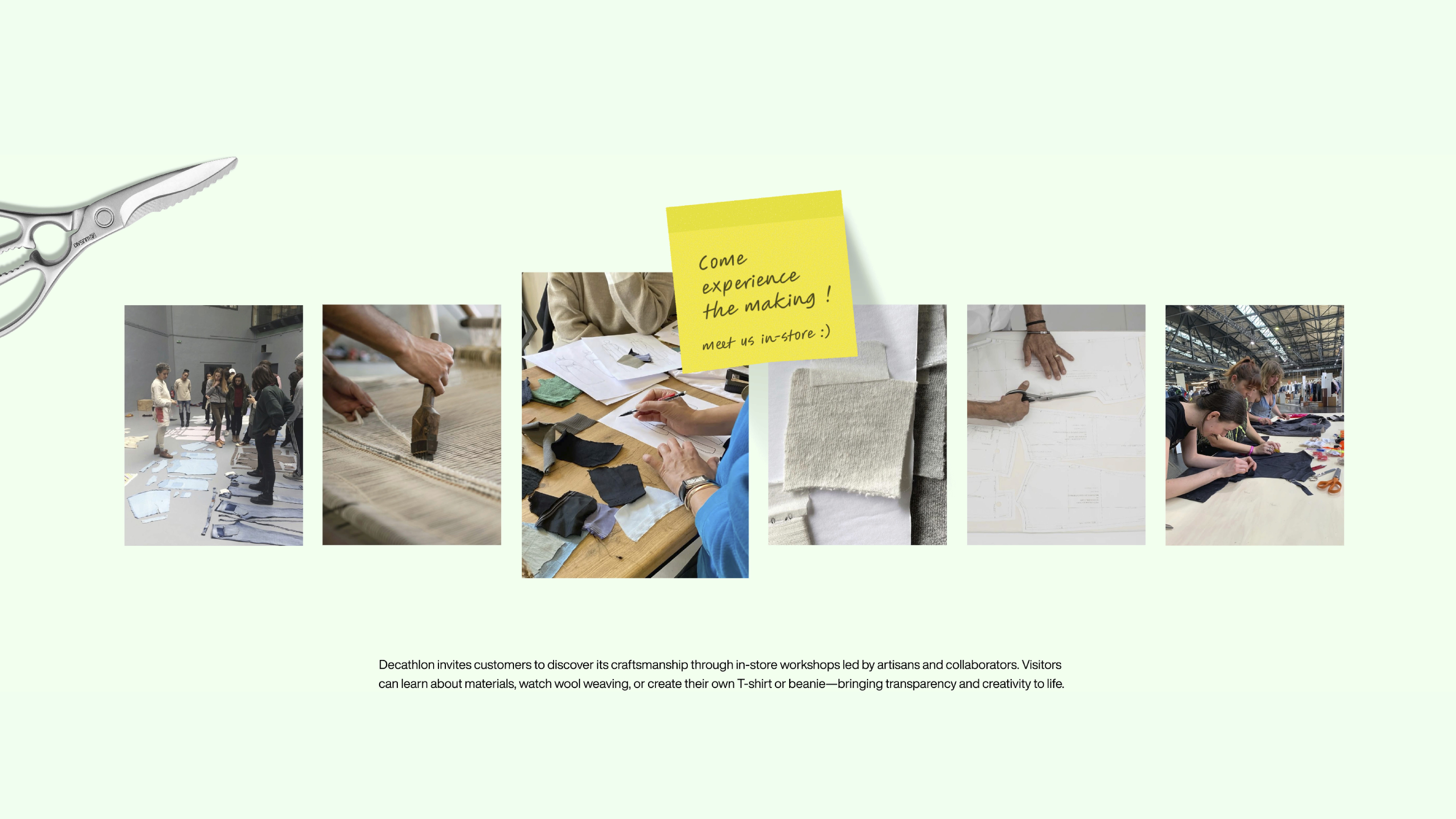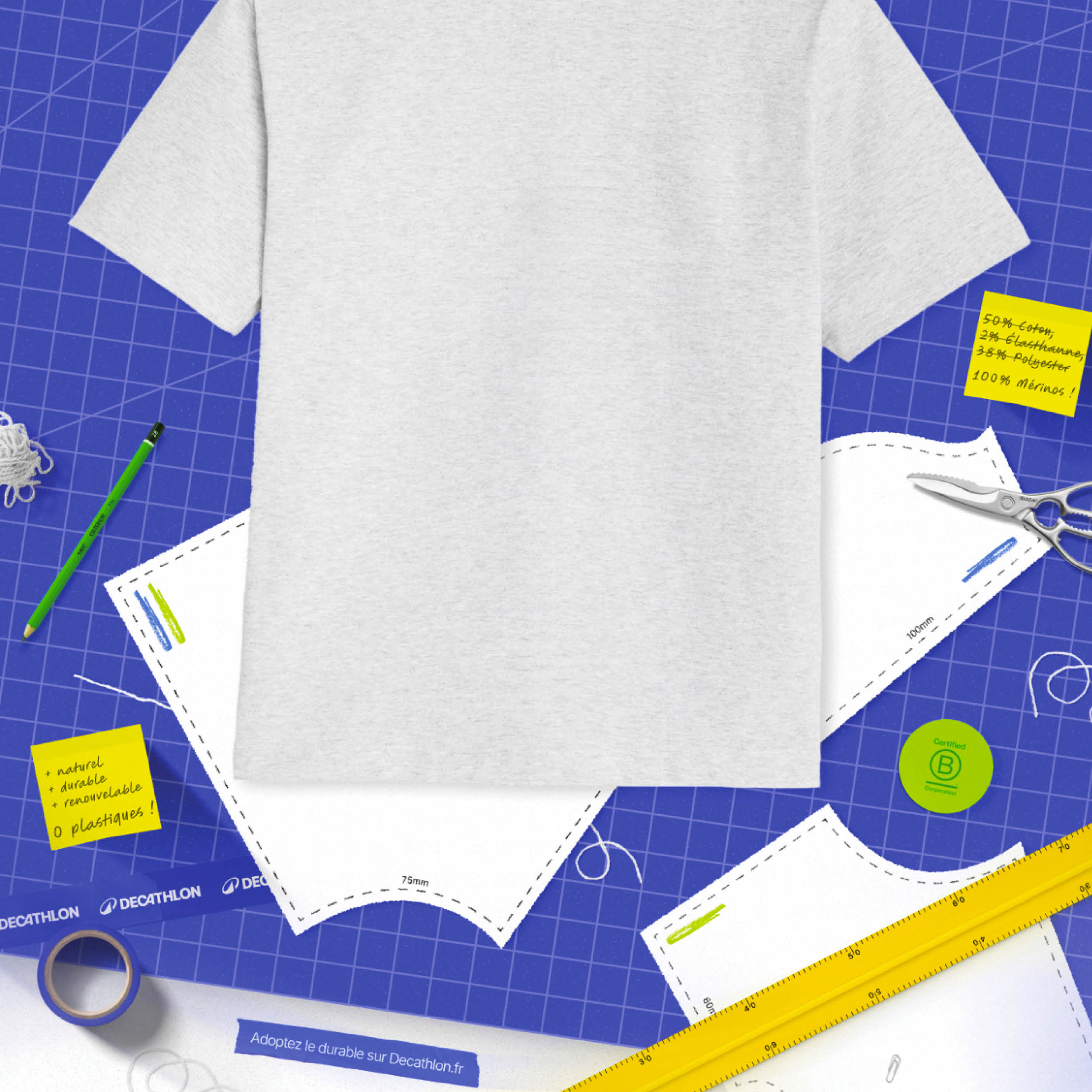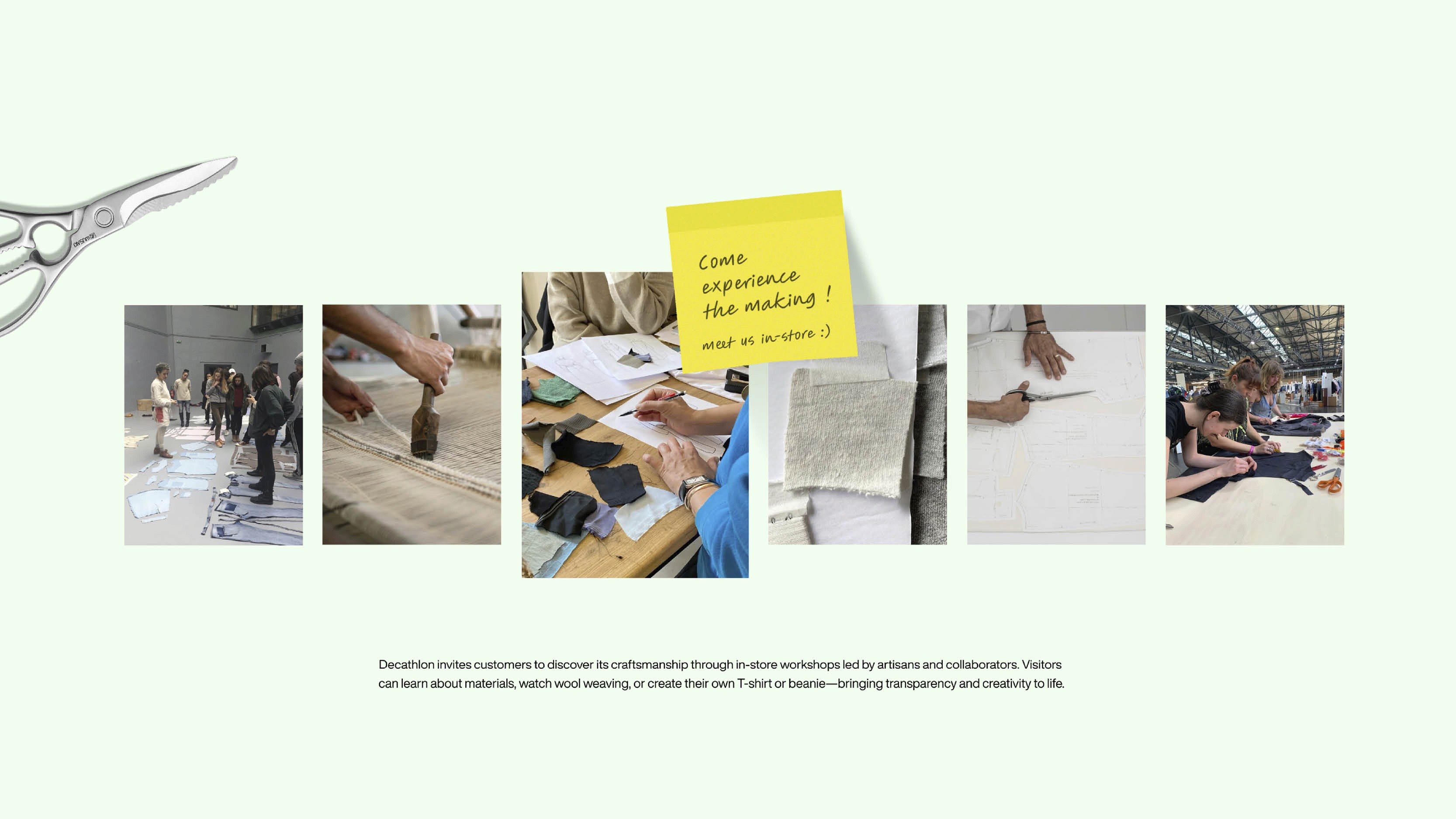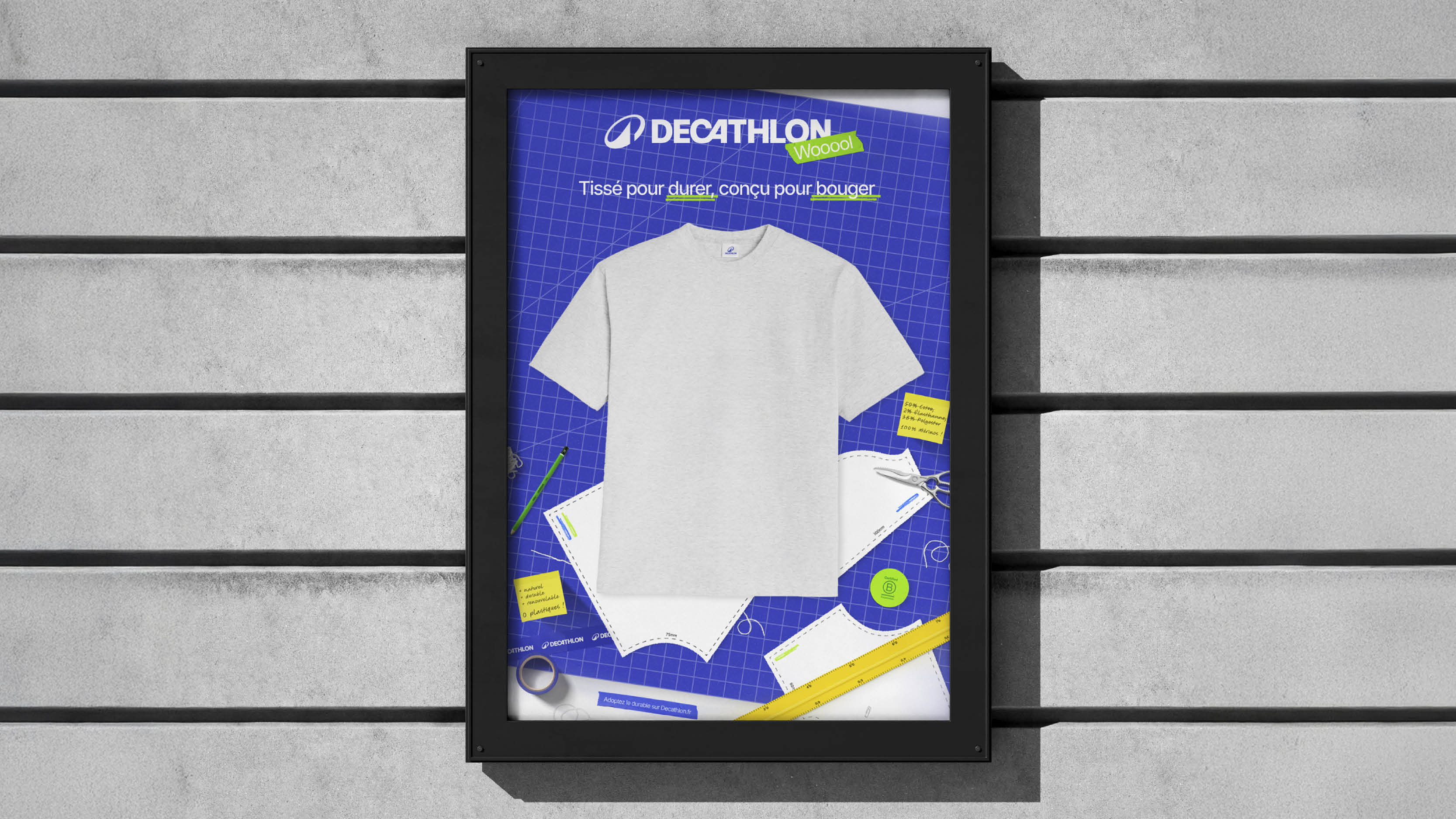 Le concept visuel final s’inspire de l’univers de l’atelier et de l’artisanat. Un t-shirt est présenté au centre d’une table de coupe, entouré d’outils de confection, tandis que des notes manuscrites apportent informations produit et authenticité. La campagne se conclut par un slogan valorisant des vêtements « Tissé pour durer, conçu pour bouger ». L’expérience est prolongée en magasin à travers des ateliers participatifs, où clients, artisans et collaborateurs Decathlon partagent savoir-faire et processus de fabrication, renforçant ainsi la transparence et l’engagement de la marque.