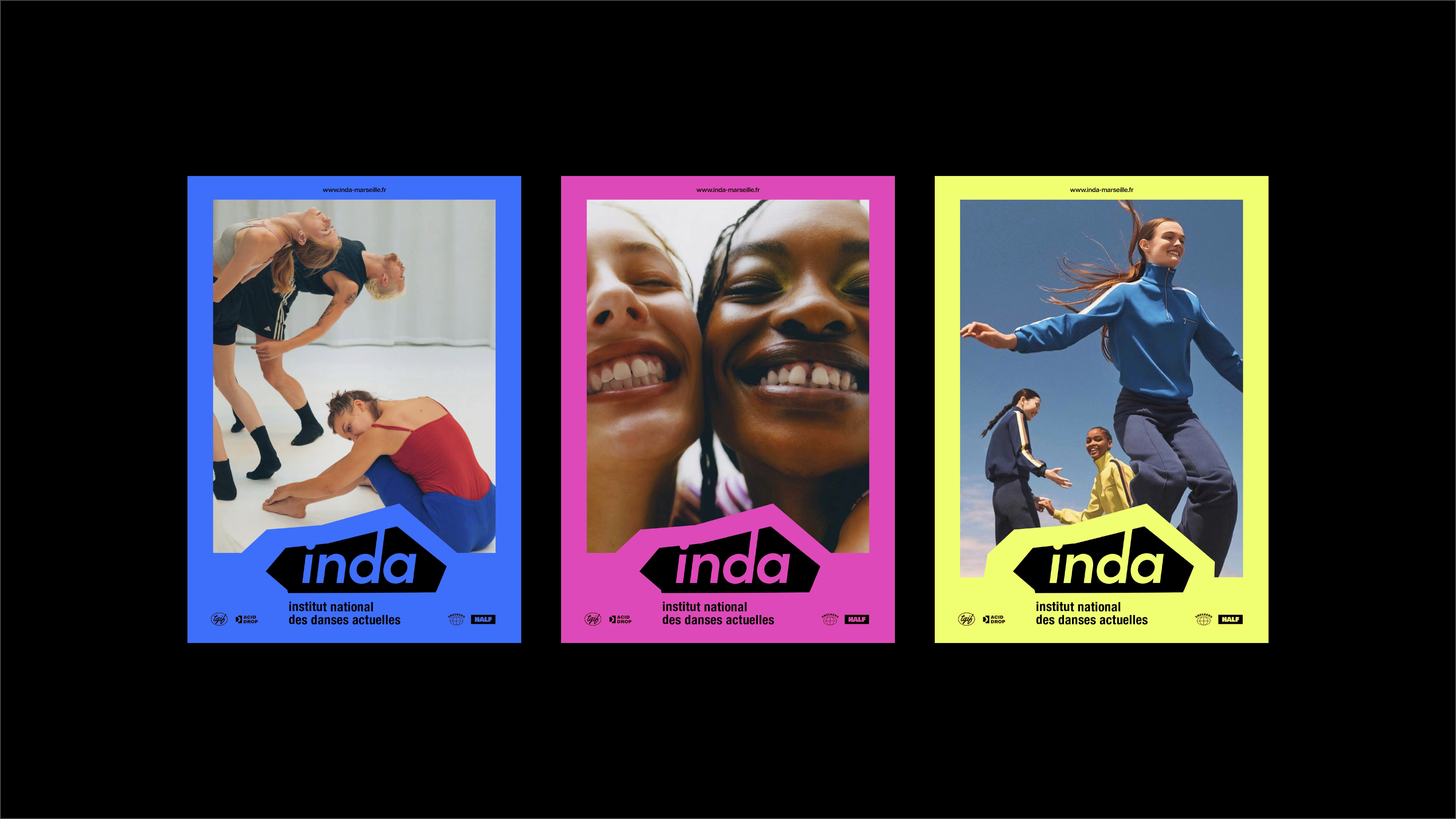 Le logo d’INDA associe minimalisme fort et symbolique expressive. Sa forme géométrique brute, inspirée de l’architecture du lieu, évoque stabilité et rigueur, tandis que la typographie italique introduit le mouvement et le dynamisme propres à la danse. Cet équilibre entre formes solides et lignes fluides traduit l’essence du centre : la rencontre entre discipline et liberté d’expression. La palette de couleurs vives et audacieuses renforce cette énergie, évoquant rythme, diversité et modernité.