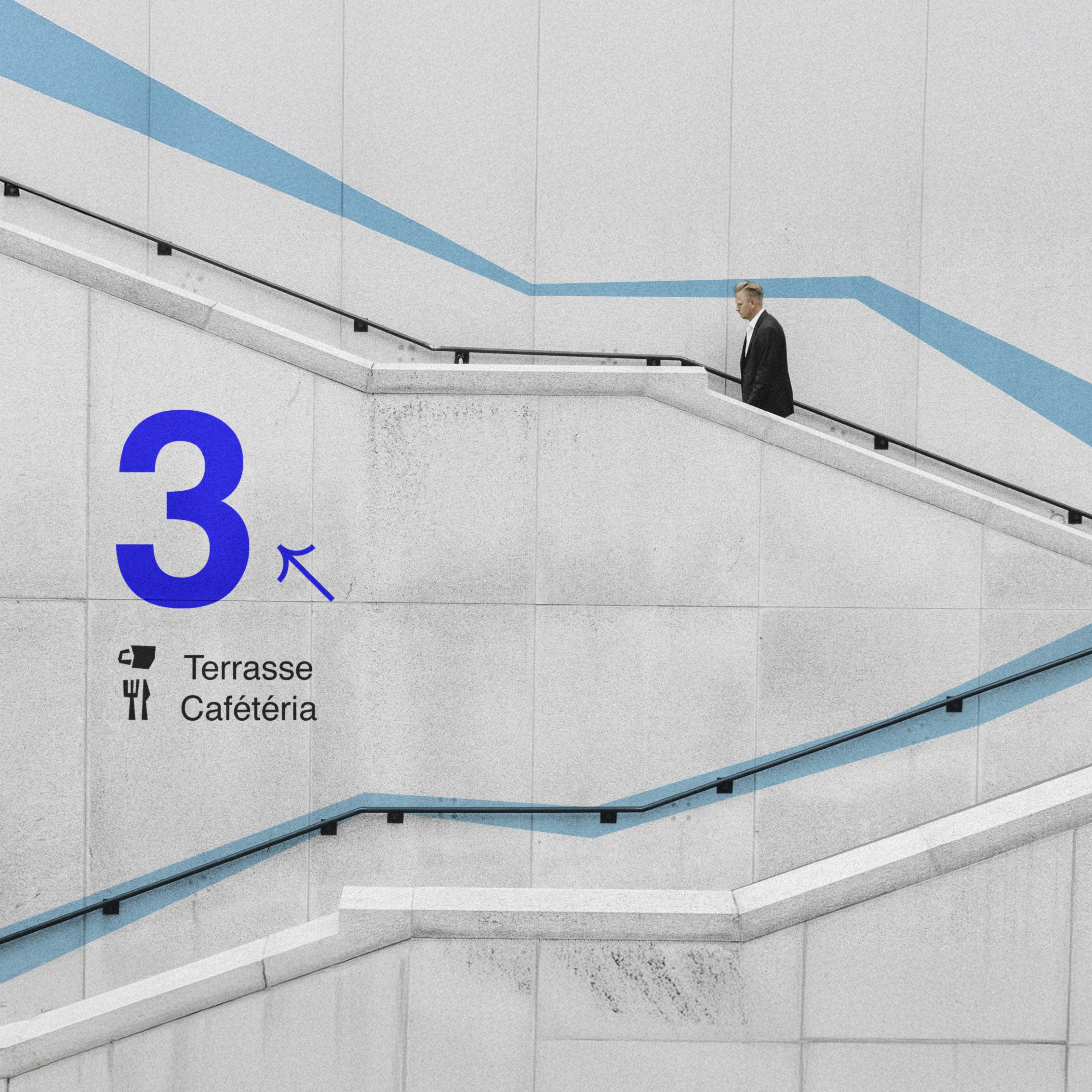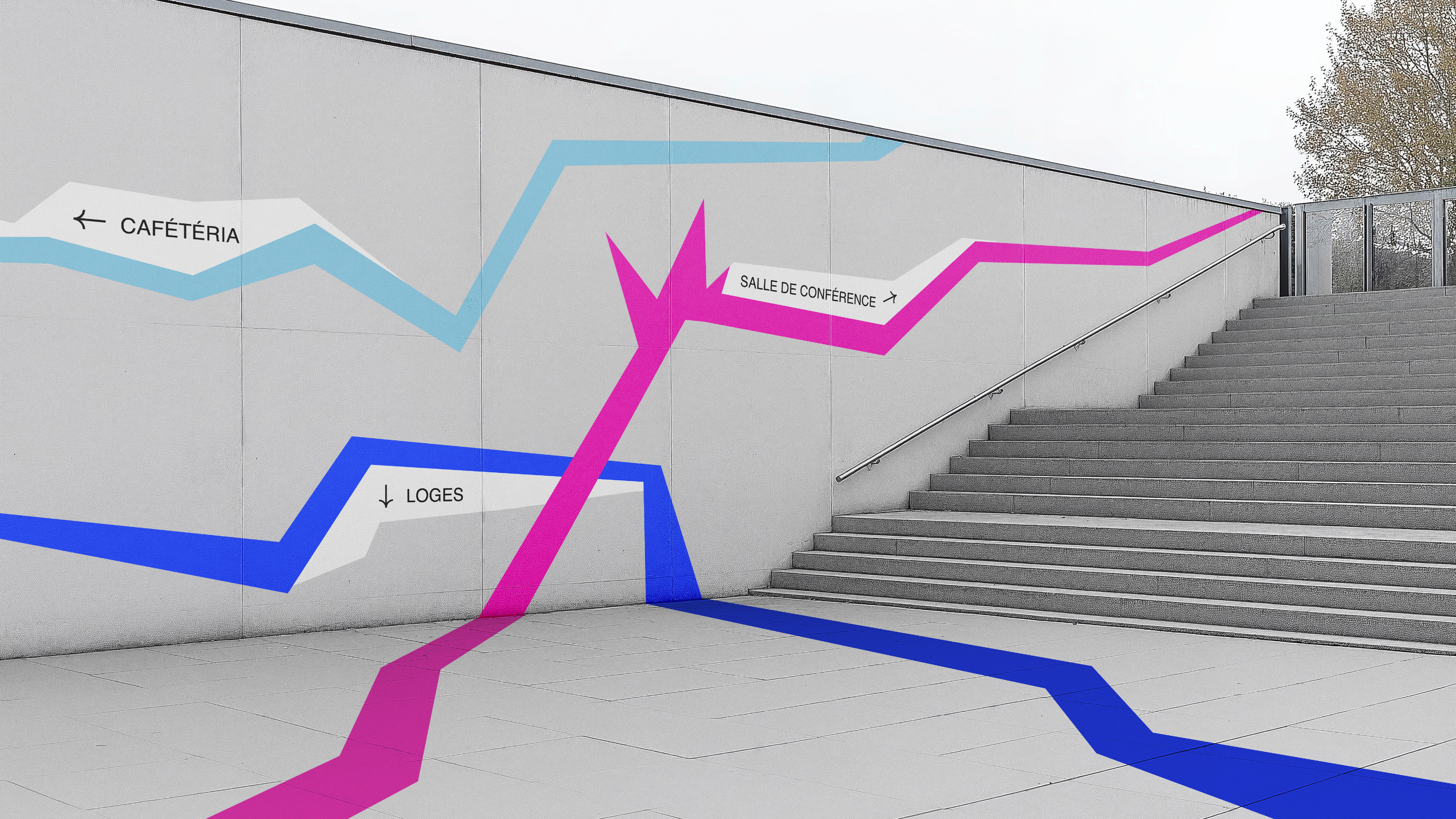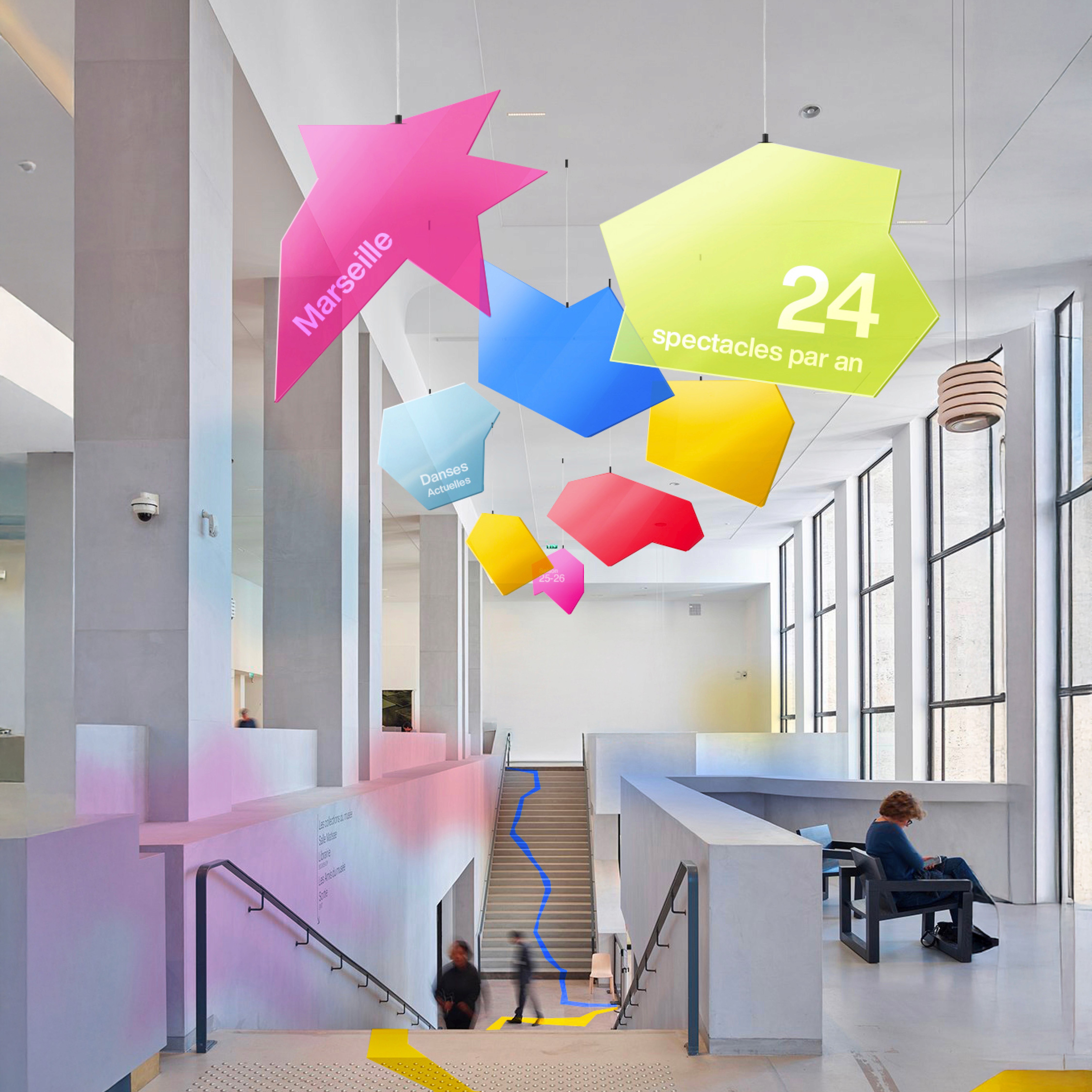 L’architecture aux formes géométriques marquées est accompagnée d’un système de signalétique coloré guidant les visiteurs dans l’espace. Des éléments en plexiglas géométriques, présents dès l’entrée et dans tout le bâtiment, assurent une signalisation claire et cohérente. L’ensemble vise à insuffler vie et énergie à un espace épuré, pour créer un lieu accueillant, lisible et propice à la créativité.