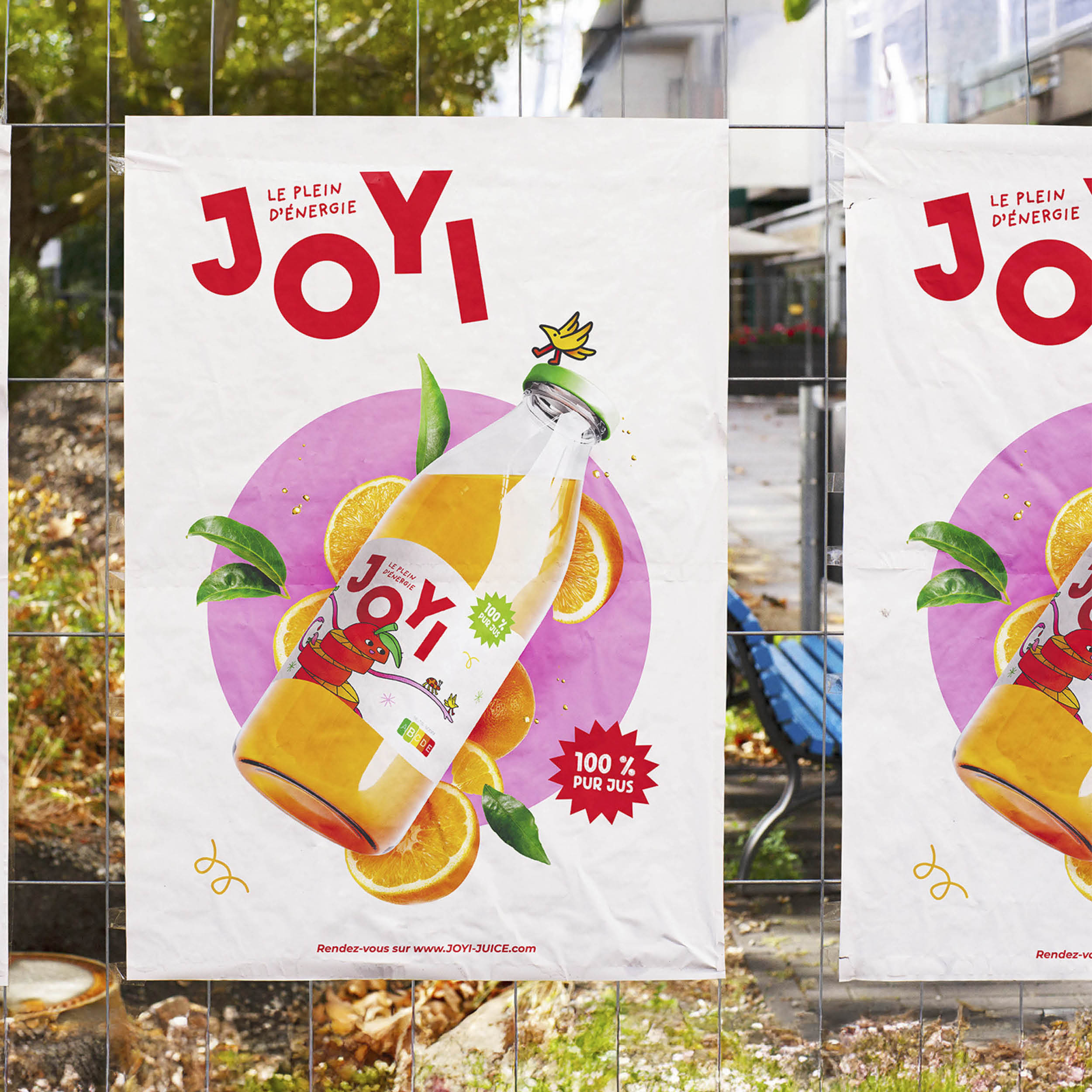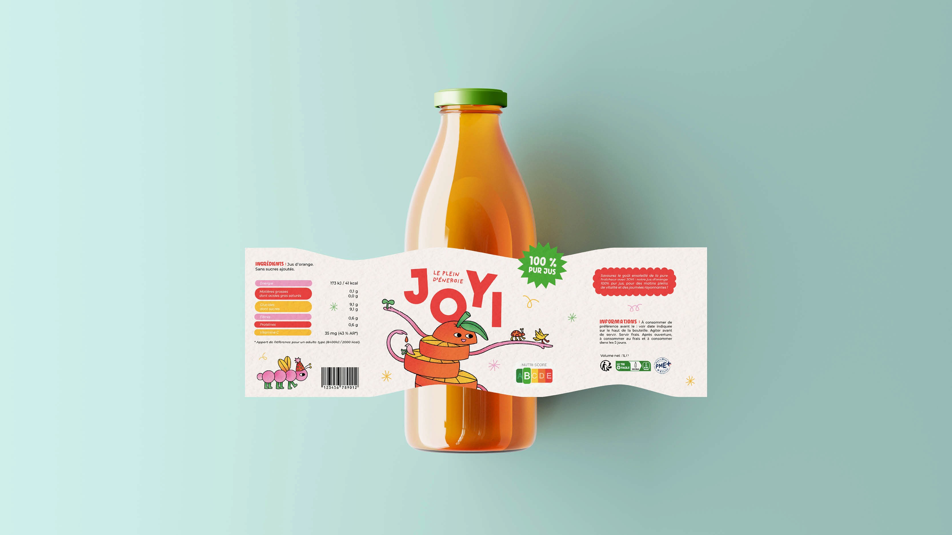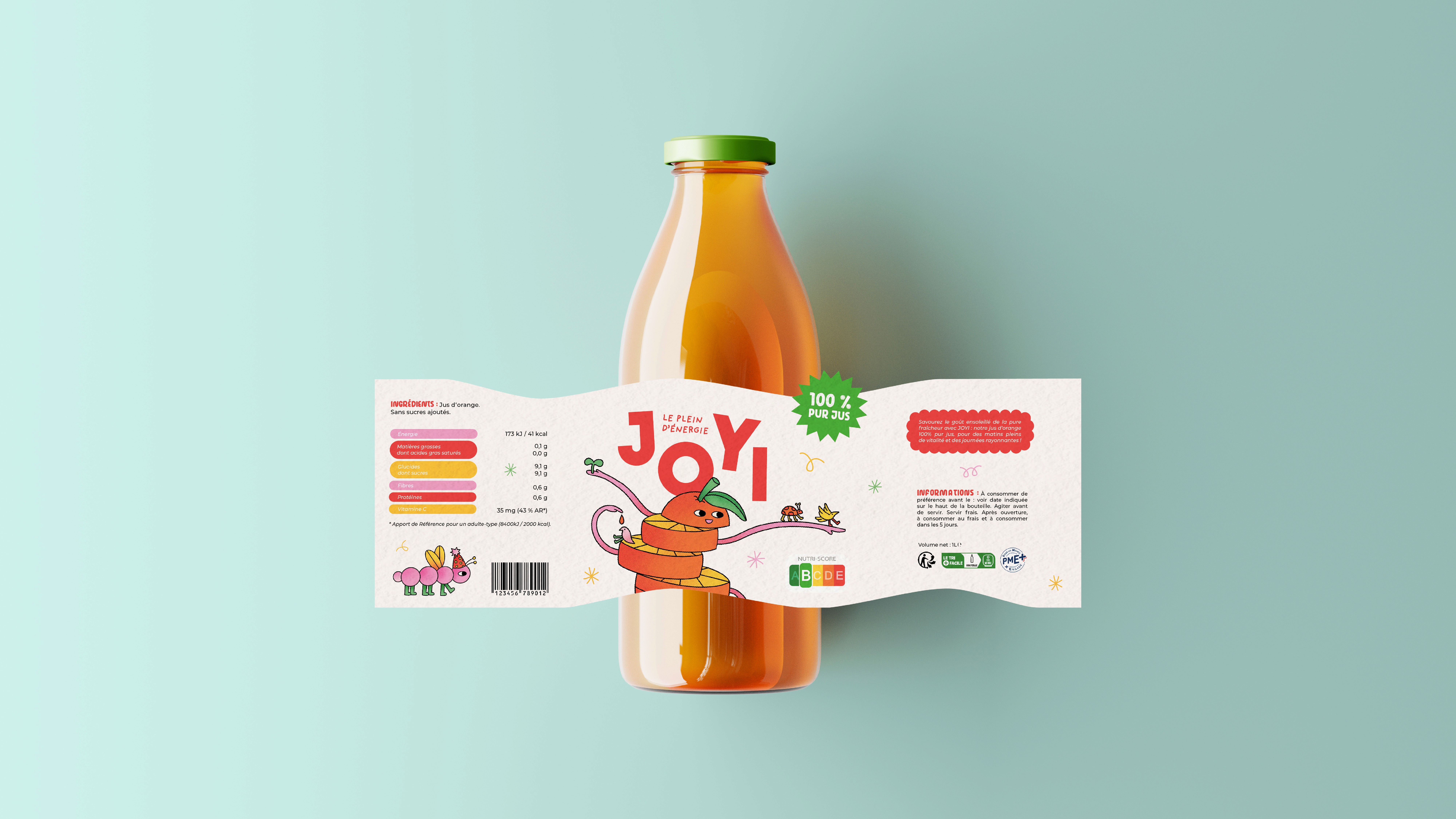 Création de l’identité visuelle et du packaging de Joyi, une nouvelle marque de jus d’orange pensée pour transmettre joie, énergie et vitalité aux enfants. L’univers graphique se veut doux et ludique, avec de petites illustrations d’orange, d’animaux et d’insectes, créant un lien empathique avec les parents tout en restant amusant et attractif pour les enfants.
