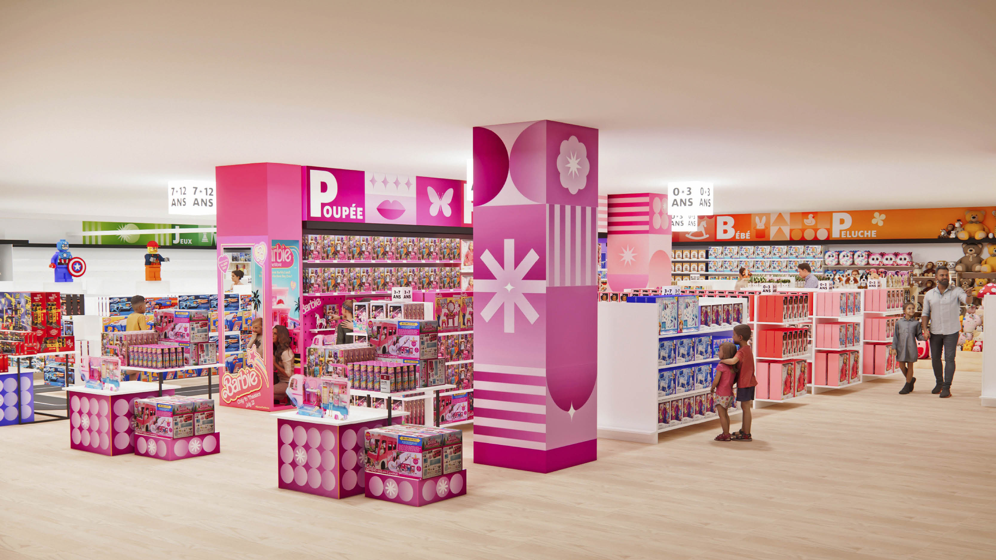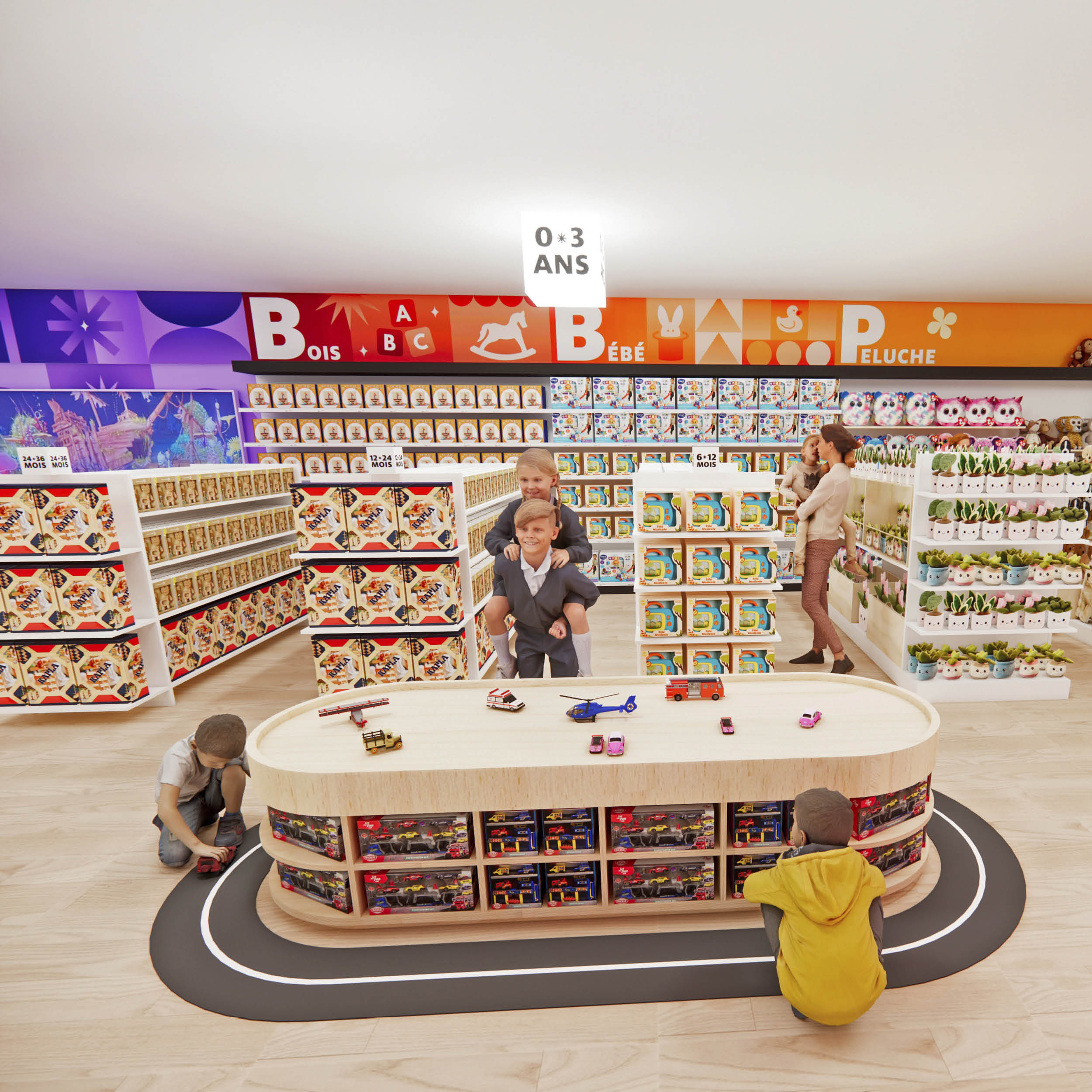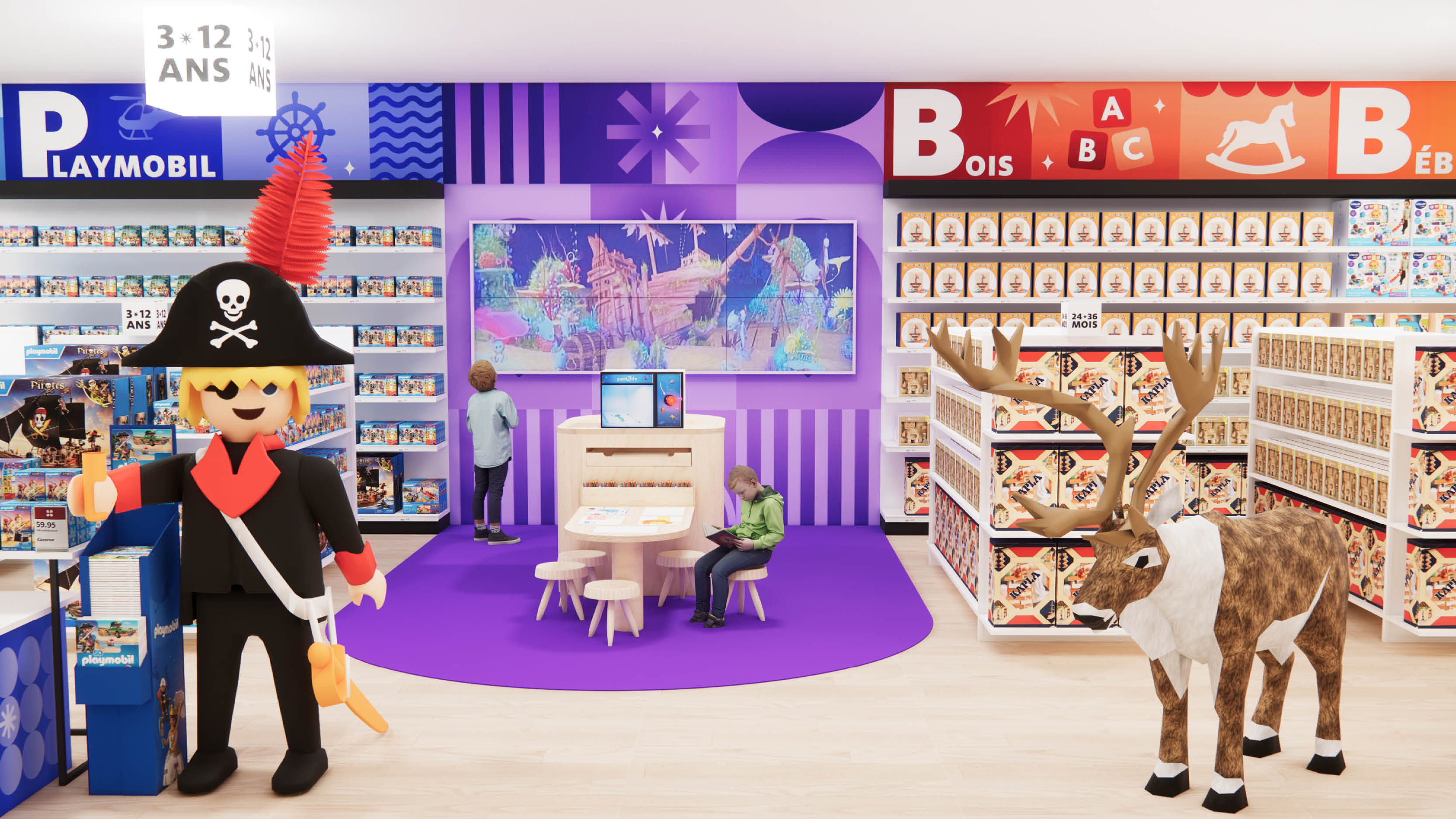 Face à un rayon jugé trop statique, le projet visait à créer un univers ludique et engageant, capable de rivaliser avec l’expérience des boutiques en ligne. La réflexion s’est articulée autour d’un environnement interactif, mêlant storytelling, animations et zones de découverte adaptées à tous les âges, soutenues par une mise en scène visuelle forte et colorée.