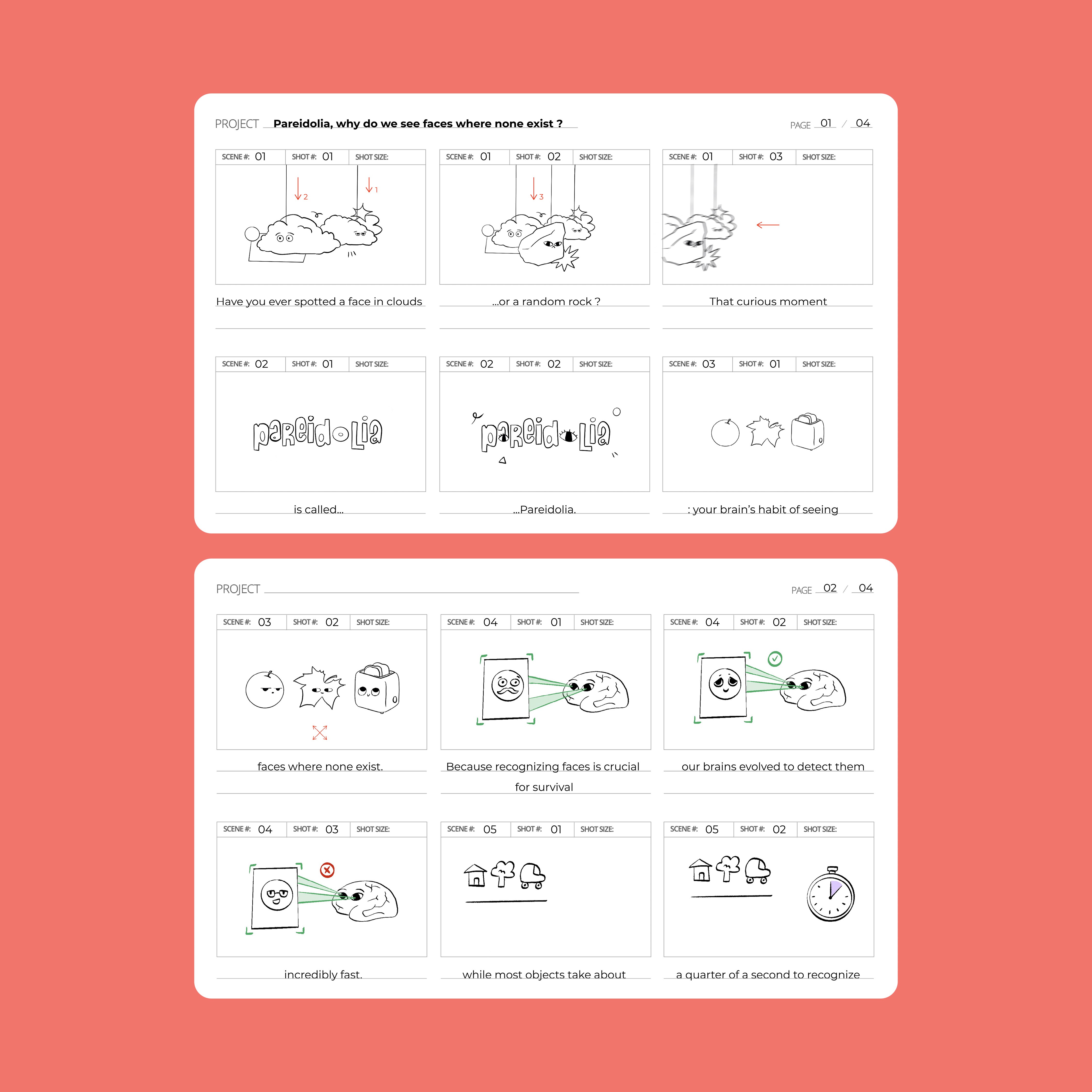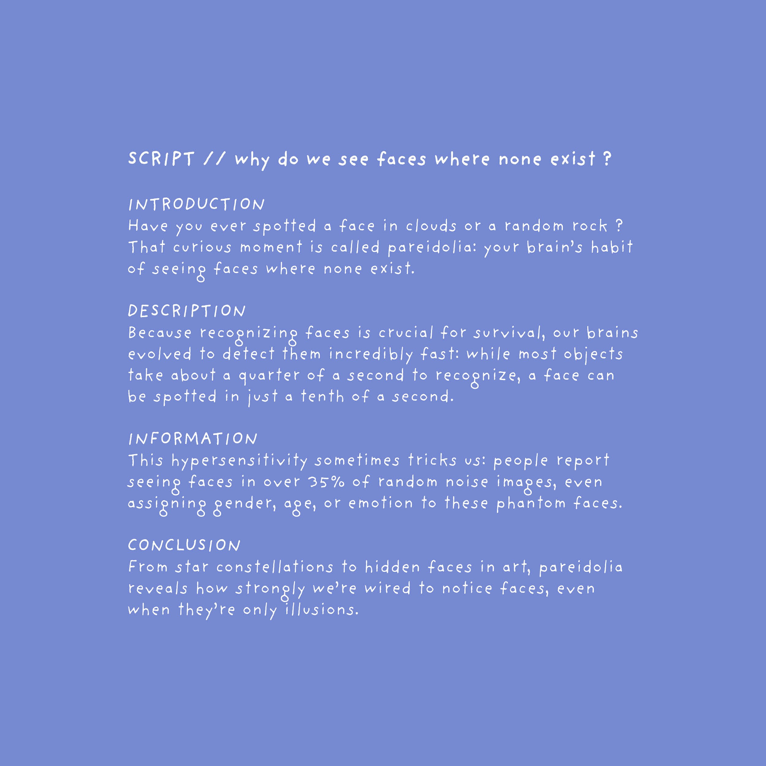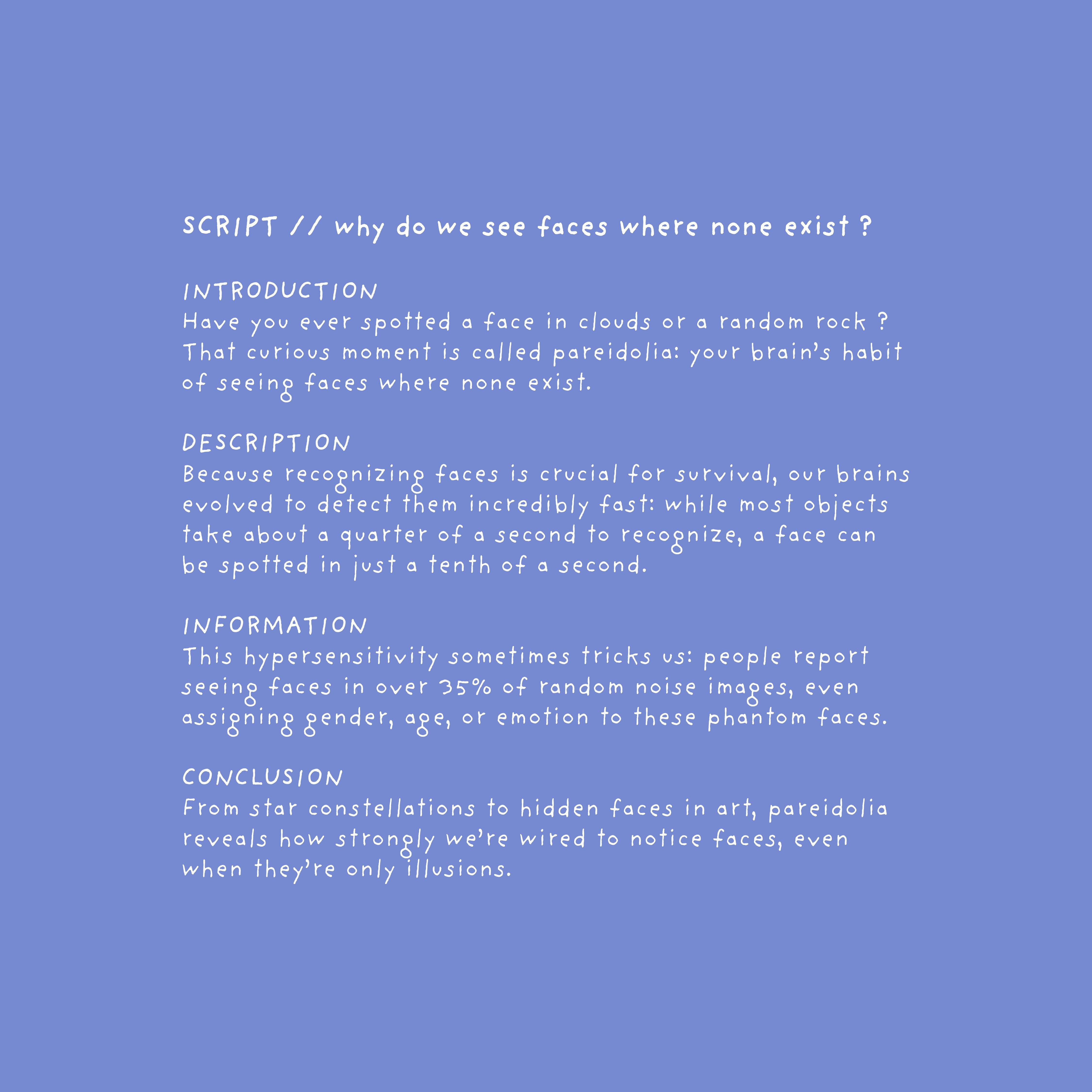 Ce motion design a été conçu pour vulgariser, en moins d’une minute, un sujet psychologique peu connu : la paréidolie, phénomène qui consiste à reconnaître des formes familières, comme des visages, dans des éléments aléatoires. La vidéo s’adresse aussi bien aux enfants qu’aux adultes, avec une approche simple, pédagogique et accessible.